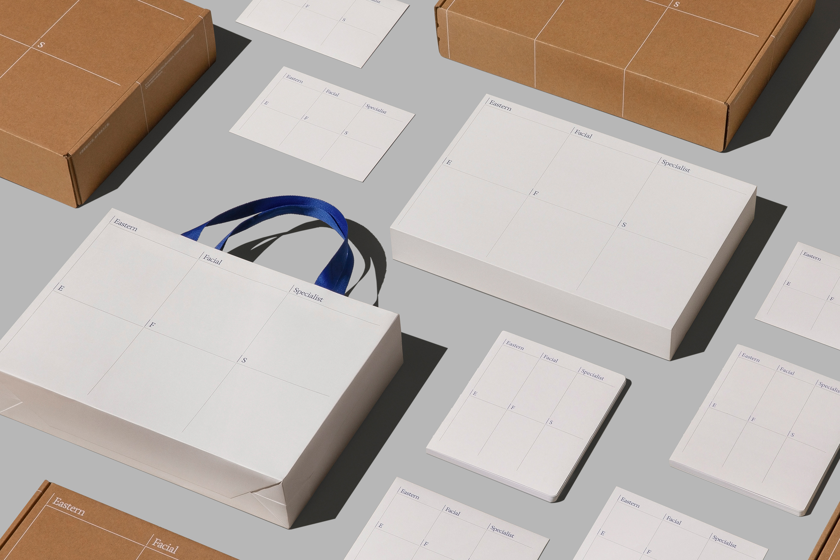 Brand identity for EFS, a Chinese specialistic skincare brand. Taking inspiration from both eastern and western aesthetics, the brand shapes a mixed image of modern oriental professional skincare solution. The visual system is a flexible typographic grid composed by the logo type mark itself, bold yet poetic.